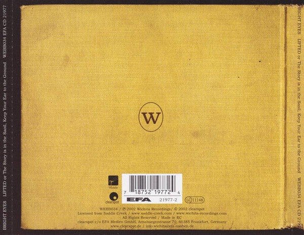 Standard jewel case with clear tray and 32-page lyrics booklet. "for Collin." Drunk Choir (XII) Everyone that was drinking at Duffy's and O'Rourke's that night Horn and String Arrangements by Andy Lemaster, Mike Mogis, Conor Oberst, and the players. This recording was made in December 2001 and January 2002 Engineered by Andy LeMaster and Mike Mogis Mixed by Mike Mogis All of this was done at Presto! in Lincoln, NE. Mastered by the very patient Doug Van Sloan at Studio B in Omaha, NE. Booking eric@groundcontroltouring.com All Songs 2002 Sony / ATV Sounds LLC / Bedrooms; Bedrooms and Spiders (SESAC) Wichita PO Box 27854 London E5 OFP info@wichita-recordings.com ℗ 2002 Wichita Recordings / © 2002 clearspot Licensed from Saddle Creek / www.saddle-creek.com / www.wichita-recordings.com Made in EC clearspot c/o EFA Medien GmbH, Arnsburgerstrasse 70, 60385 Frankfurt, Germany www.clearspot.de / info.wichita@efa-medien.de