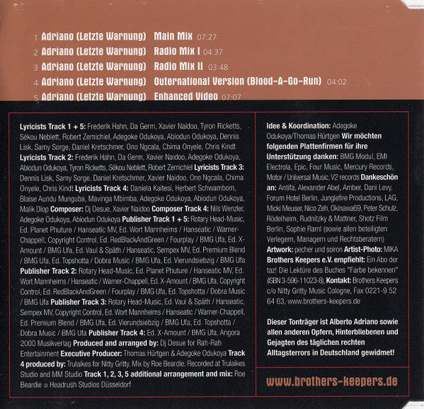 ℗ + © 2001 WEA Records / Warner Music Germany GmbH. A Warner Music Group company Dieser Tonträger ist Alberto Adriano sowie allen anderen Opfern, Hinterbliebenen und Gejagten des täglichen rechten Alltagsterrors in Deutschland gewidmet! Made in Germany by Warner Music Manufacturing Europe Video: Adriano.MOV, 200x216 pixels, 160 MB