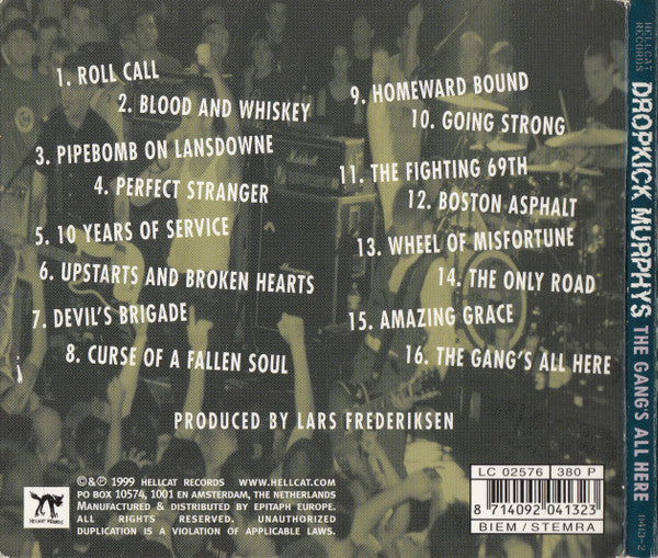 ©&℗ 1999 Hellcat Records Issued in a black tray Digipak with a 4-page booklet. Track Duration taken from Media Player. Track 16 contains an untitled hidden track after 2:23 minutes of silence. Total Duration 7:59. DIGIPAK® Manufactured by Van de Steeg, Holland, under license from AGI, USA Recorded at The Outpost Studios - Stoughton,MA All songs published by Boston Scally Punk Publishing (ASCAP) / Dr Zeuss Music (ASCAP) Writing credits are written as: All songs written by the Dropkick Murphys (Barton, Casey) or (Barton, Casey, Kelly) except - Amazing Grace and The Fighting 69th (traditional arranged by Dropkick Murphys)