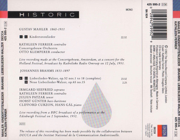 Kathleen Ferrier, Otto Klemperer, Concertgebouw Orchestra*, Mahler* / Brahms* : Kindertotenlieder / Liebeslieder-Walzer (CD, Mono, RM)