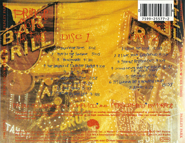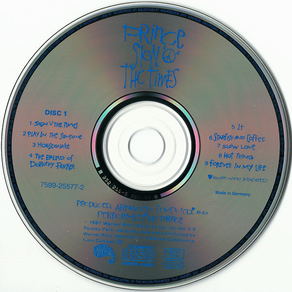 This version has "SRC" in both matrices, no SID codes. Thick (Fatboy) jewel case Two 12-page booklets, for each disc: track list, release credits, lyrics, track credits Artist and Release Title appear on a heart shaped sticker attached to jewel case front, with "Specially-Priced Double Compact Disc 925 577-2". "Sign "O" The Times" appears release wide as "Sign "☮" The Times". Manufactured in Germany [rear tray insert Made in Germany [discs 7599-25577-2 [spines, rear tray insert & booklets 925 577-2 [title sticker © 1985 Warner Bros Records Inc. for the U.S. [booklets ℗ 1985 Warner Bros Records Inc. for the U.S. and WEA International Inc. for the world outside of the U.S. [rear tray insert & discs Durations: 5:02. 5:05. 4:38. 4:04. 5:10. 2:51. 4:18. 5:39. 3:38. // 3:58. 4:54. 4:04. 6:31. 4:46. 8:59. 6:29. [printed, rear tray insert & booklets 4:56. 5:05. 4:42. 4:01. 5:09. 2:50. 4:22. 5:39. 3:30. // 3:47. 5:01. 4:01. 6:29. 4:48. 9:01. 6:30. [actual, media player