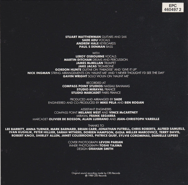 ℗ 1988 CBS Records © 1988 CBS Records On disc: "Made in Austria" On backsleeve: "Printed in Holland" List of European releases with the same cat#: - [r=10708899: BIEM, no SID codes; - [r=6074579: BIEM, SID codes, DADC Austria; - [r=11323862: BIEM, SID codes, Sony Music; - [r=4691285: BIEM/STEMRA, CB 821, CF; - [r=8429890: BIEM/STEMRA, CB 701, 460497 2 in booklet; - [r=226309: BIEM/STEMRA, CB 701, EPC 460497 2 in booklet; - [r=7338288: MCPS/BIEM/STEMRA, CB821, CF, Made in Switzerland; - [r=5941596: MCPS/BIEM/STEMRA, CB821, CF, Made in Austria; <-- this release - [r=18679750: MCPS/BIEM/STEMRA, CB821, CF, Made in U.S.A.; - [r=13199212: MCPS/BIEM/STEMRA, CB821, CF/CDE, no manufacturer, no disc rim text; - [r=1236532: MCPS/BIEM/STEMRA, CB821, CF/CDE, DADC Austria; - [r=15833396: MCPS/BIEM/STEMRA, CB821, CF/CDE, DADC Austria, Nice Price; - [r=16251260: MCPS/BIEM/STEMRA, CB821, CF/CDE, DADC Austria/Digital Audio Disc Corp.