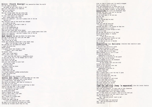 This version is glass mastered at DADC Austria. For a similar version but glass mastered by Sony DADC see [r=382136. All songs published by Gamete Music BMI and administered for the world by westbeach music BMI 1994, except Killboy Powerhead, published by Touch and Go Records Recorded & Mixed at Track Record, North Hollywood Additional Recording at The Hook, North Hollywood Mastered at Futuredisc [on back cover & booklet ©℗ 1994 Epitaph [on disc © + ℗ Epitaph 1994
