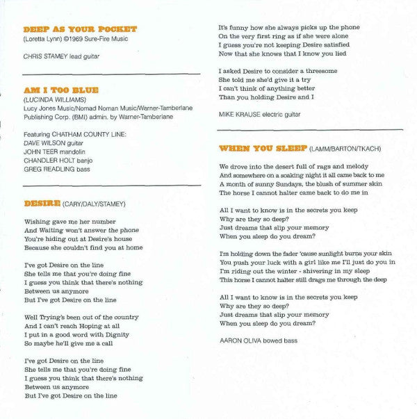 Includes an 8-page booklet with all lyrics. ℗ & © 2004 Yep Roc Records. Manufactured & distributed by Redeye Distribution. Recorded on location at Modern Recording, Chapel Hill, NC. Mixed at Modern. Mastered at The Kitchen, Carrboro, NC. Produced for Orange. Publishing Information: Track 4 © 1969 Sure-Fire Music Track 5 published by Lucy Jones Music/Nomad Norman Music/Warner-Tamberlane Publishing Corp. (BMI) admin. by Warner-Tamberlane. Track 10 published by Fort Knox Music, Inc./Trio Music, Inc., BMI. Remainder of publishing credits provided solely by artist name: Lynn Blakely: Henny Penny Music, BMI, admin. by Bug; Caitlin Cary: Texas Brown Dog Music, BMI, admin. by Bug; Tonya Lamm: Babylamm Songs, ASCAP, admin. by Bug; Shawn Barton: Sparkles Music, ASCAP, admin. by Bug; Mike Daly: Caitlin-Breanne Music, ASCAP, admin. by Bug; Chris Stamey: ShangMoto Music, BMI, admin. by Bug; and Anne Tkach: Random Crush Vortex Music, ASCAP, admin. by Bug.