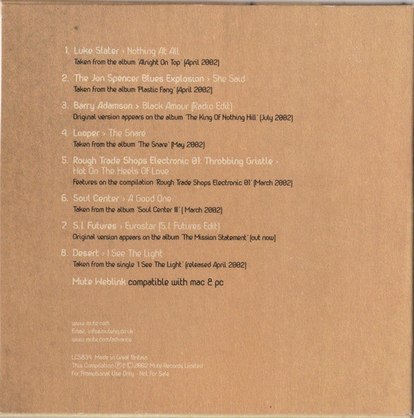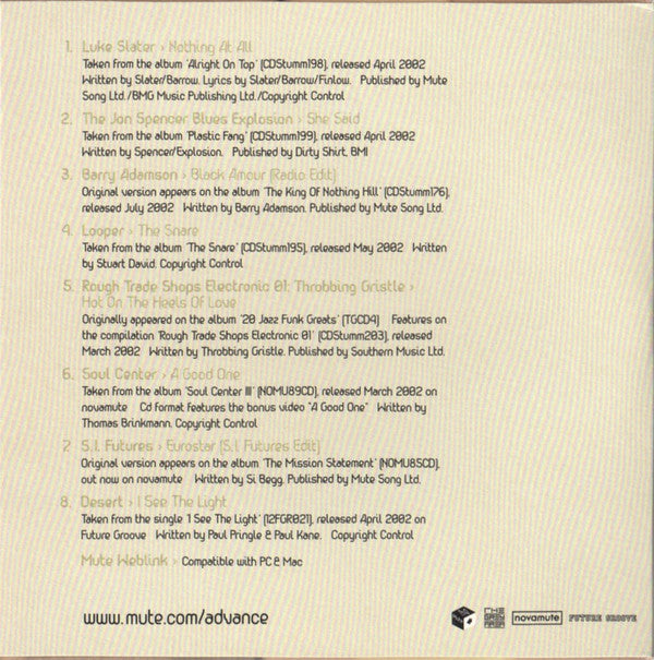 Track 1 Taken from the album Alright on top (CDStumm198), released April 2002 Track 2 Taken from the album Plastic fang (CDStumm199), released April 2002 Track 3 Original version appears on the album The king of Nothing Hill (CDStumm176), released July 2002 Track 4 Taken from the album The snare (CDStumm195), released May 2002 Track 5 Originally appeared on the album 20 jazz funk greats (TGCD4) Features on the compilation Rough trade shops electronic 01 (CDStumm203), released March 2002 Track 6 Taken from the album Soul Center III (NoMu89CD), released March 2002 on novamute CD format features the bonus video A good one Track 7 Original version appears on the album The mission statement (NoMu85CD), out now on novamute Track 8 Taken from the single I see the light (12FGR021), released April 2002 on Future Groove This compilation is for promotional use only - not for sale