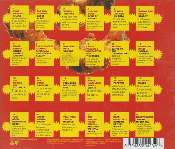 [Track#: publisher / copyrights) 1: Redpoint Music Ltd./Chrysalis Music Ltd. / (p) 2003 Horseglue Records. Under exclusive license from Pink Grease/Killer Killer Productions 2: Schnozza Music / (p) 2002 DC Recordings. Licensed courtesy of DC Recordings 3: Copyright control / (p) 2003 Nathan Whitey. Licensed courtesy of Nathan Whitey 4: Copyright control / (p) 2003 Broken Claw Records. Licensed courtesy of Broken Claw Records 5: EMI Music Publishing/copyright control / (p) 2003 Klang. Licensed courtesy of Klang 6: Copyright control / (p) 2003. Licensed courtesy of Big Cat (UK) Records Ltd. 7: Copyright control / (p) 2002 Erase Errata. Licensed courtesy of Blast First 8: Copyright control / (p) 2002 Elbandito Recordings. Licensed courtesy of Elbandito Recordings 9: Copyright control / (p) 2003 Montana Pete. Licensed courtesy of Montana Pete 10: Copyright control / (p) 2003 Crack Village. Licensed courtesy of Crack Village/New Breed Crew 11: La Chunga / (p) 2002 Gern Blandsten. Licensed courtesy of City Slang 12: Copyright control / (p) 2002 Pure Groove Music Ltd. Licensed courtesy of Pure Groove Music Ltd 13: Copyright control / (p) 2003 Frenchkiss Records. Licensed courtesy of Frenchkiss Records 14: Copyright control / (p) 2002 Rock Action Records. Licensed courtesy of Rock Action Records 15: Copyright control / (p) 2000 !!!. Licensed courtesy of !!! 16: Copyright control / (p) 2003 Kings Have Long Arms. Licensed courtesy of Twins Of Evil 17: Copyright control / (p) 2003 Valerie. Licensed courtesy of Valerie 18: Copyright control / (p) 2003 High Society Records. Licensed courtesy of High Society Records 19: (p) 2003. Licensed courtesy of Todd 20: Copyright control / (p) 2002 Westbury Music. Licensed courtesy of Ace Of Discs 21: Chrysalis Music (p) 2002 Wichita Recordings. Licensed courtesy of Wichita Recordings 22: Copyright control / (p) 2002 Louder und schneller. Licensed courtesy of Louder und schneller 23: Copyright control / (p) 2003 Chips Records. Licensed courtesy of Chips Records 24: Death Trip 666 Publishing / (p) 2002 Catastrophic. Licensed courtesy of Catastrophic Track 2 taken from Big Two Hundred 'Your Personal Filth' Track 3 remastered in the Woodshed Track 7 taken from the album 'www.discogs.com/Erase-Errata-Other-Animals/master/40669Other Animals' Track 9 taken from the album '[r=9941019' Track 11 taken from the album 'www.discogs.com/Radio-4-Gotham/master/43291Gotham!' Track 16 taken the debut KHLA LP Track 19 taken from the 'www.discogs.com/Todd-Todd/master/207756Todd EP'. The release refers to this as the 'Solid Gold Death Mask EP' Track 21 taken from the 'www.discogs.com/Yeah-Yeah-Yeahs-Machine/master/33477Machine EP' Sonic Mook Experiment © Sean McLusky Printed in the EU. This compilation (P) & (C) 2003 Blast First / Mute Records Limited Made in the EU. Issued in a jewel case with clear tray and 12-page booklet.