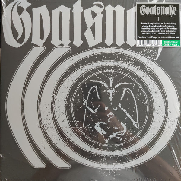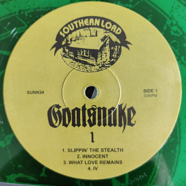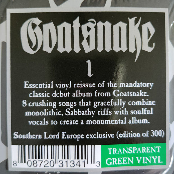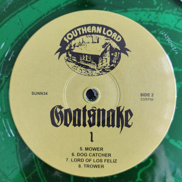 Southern Lord Europe exclusive on transparent green vinyl, edition of 300. Single sleeve, standard black inner sleeve, no insert. Barcode on hype sticker on shrink wrap. MADE IN CZECH REPUBLIC on sticker on back shrink wrap. I Recorded by Count Schneeberger @ his Gas Chamber in Los Angeles Summer 97 & Spring 98. Buzz Osbourne (Commando) [produced fucked with Dogcatcher. Mastered at Capitol Mastering. All songs copyright 1998 Goatsnake. Published by Big Plastic Things (ascap) & Sabbath Rehash (bmi). Thanks to all who have helped out on this project. Thanks to Lee Dorrian / Rise Above & Frank Kozik / Man's Ruin for originally releasing these recordings. Goatsnake uses Sunn Amps, Gibson Guitars & Basses and Sabbath riffs exclusively, because they want the best. I was originally released by Man's Ruin Records as MR174CD/LP in 1999 & Rise Above Records as CDRISE22.