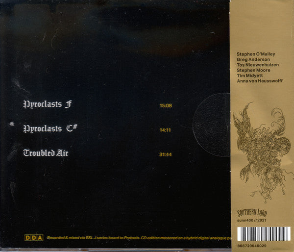 Comes in a regular plastic case with clear tray and obi. Includes a 8-page fold-out sheet. Recorded at BBC Maida Vale in studio 4 on 29 October 2019 for Mary Anne Hobbs's show on BBC6Music. First broadcast 31 October 2019 Back cover: Recorded & mixed via SSL J series board to Protools. CD edition mastered on a hybrid digital analogue path. Artwork: "A Great Weight Lifting" & "Cries & Whispers" (2020), "Fiona" & "William" (2018), "Pitch" & "Arise" (2017) Samantha Keeley Smith. 2019 evocation by Edwin "Savage Pencil" Pouncey. Inner cover: "You cannot know Sunn O))) Surrender the apparatus and the information you use to make measurements.. Walk to the Edge of what it is you think you know A namespace space... Sunn O))) are in the atom and the expanse... Sunn O))) will cast their waveforms like red ribbons across this borderless field.. Drawing us together and folding away the vast spaces, the loneliness, to nothing.. - m/a London April 2021"