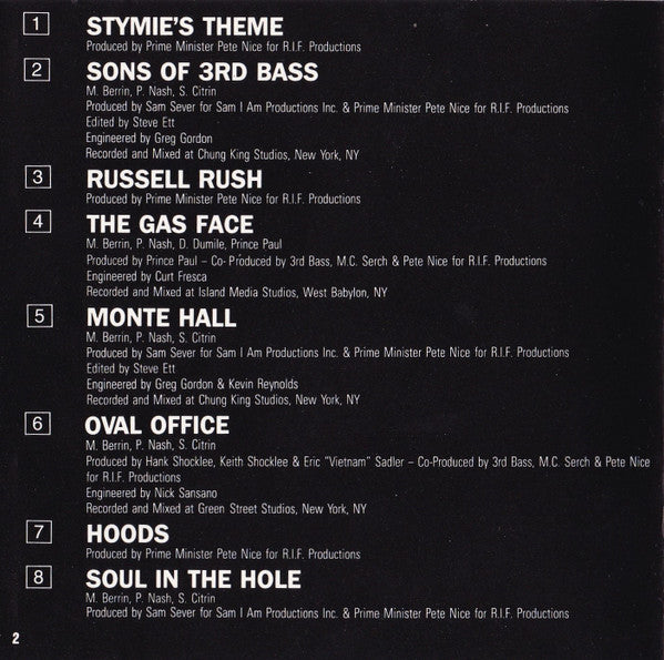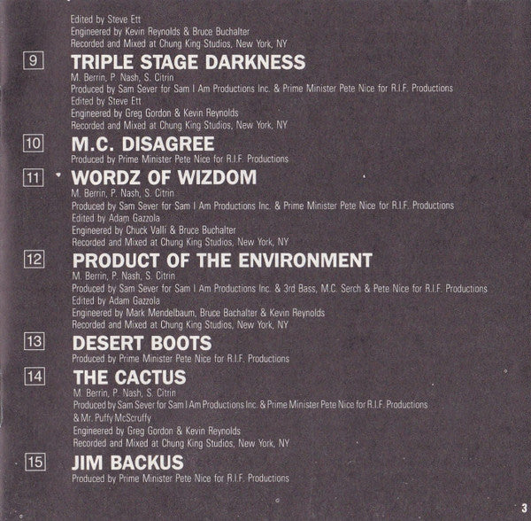 Assorted samples: Track 1 is an uncredited sample of "Good Old Days" by Leroy Shield Track 2 has an uncredited sample of "Spinning Wheel" by Blood, Sweat & Tears Track 4 has an uncredited sample of "Think" by Aretha Franklin Track 6 has an uncredited sample of "Pump Up The Volume" by M|A|R|R|S Track 8 has an uncredited sample of "Rise" by Herb Alpert Track 9 has an uncredited sample of a sample from "Rubber Ring" by The Smiths Track 11 has uncredited samples of "Love Is Alive" and "Dream Weaver" by Gary Wright Track 16 has an uncredited sample of "Way Down In The Hole" by Tom Waits. Track 17 has an uncredited sample of "Best Of My Love" by The Emotions Track 18 has uncredited samples of "Time" by Pink Floyd, "The Bird" by The Time and "Time To Get Ill" by Beastie Boys Track 20 has a sample of Abbott & Costello Track 21 has an uncredited sample of "Never Let Me Down Again" by Depeche Mode Printed in U.S.A.