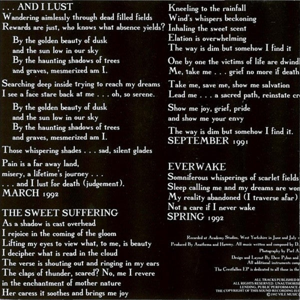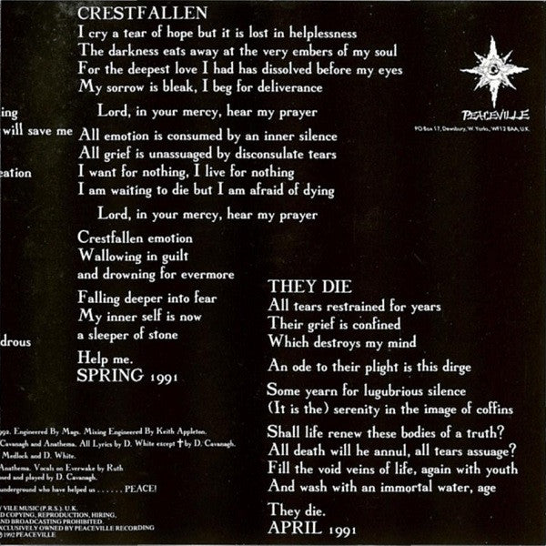 Recorded at Academy Studios, West Yorkshire in June & July 1992. All tracks published by Vile Music (P.R.S.) U.K. Made in England. © 1992 Vile Music ℗ 1992 Peaceville