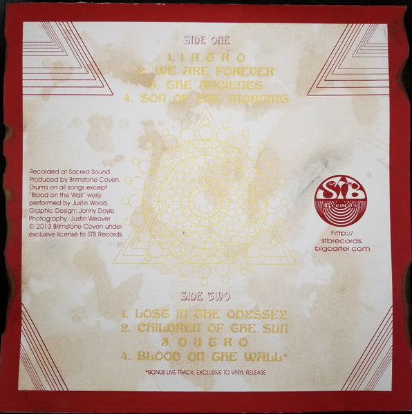 Die Hard Edition - gold and silver color-in-color, high quality vinyl, limited to 50 units. Heavy duty 236lb natural white 100% Egyptian cotton card stock cover, letter pressed band logo, incense scented brown and black oiled inks, gold leaf print, distressed & burned cover to mimic an old spell book. Finally, wrapped with a leather rope to keep all the secrets of the Brimstone inside. Hand screened, hand numbered, comes with a Brimstone Coven sticker & pin, and a STB Records sticker & pin. Blood On The Wall is a bonus live track, exclusive to the vinyl release.